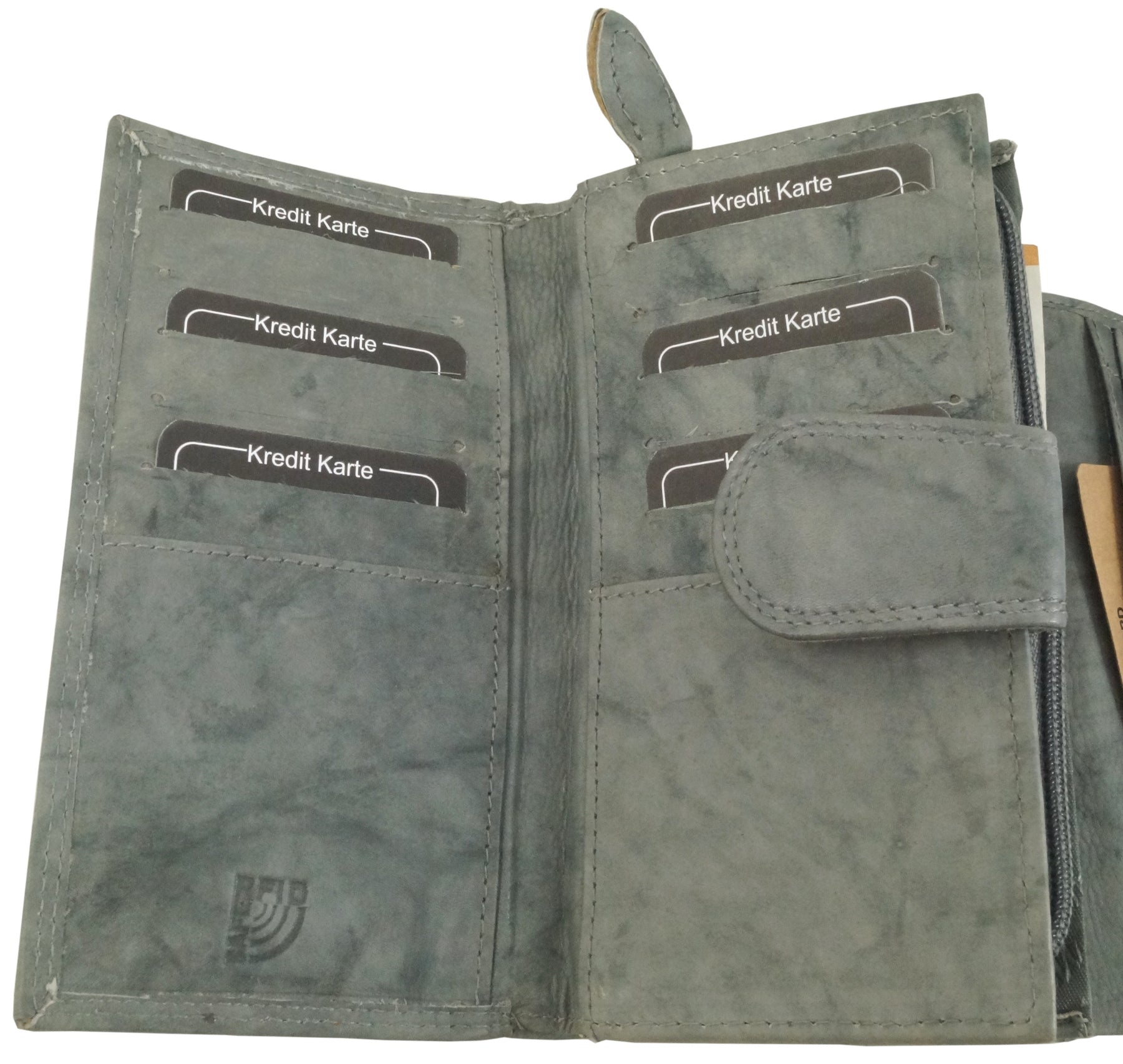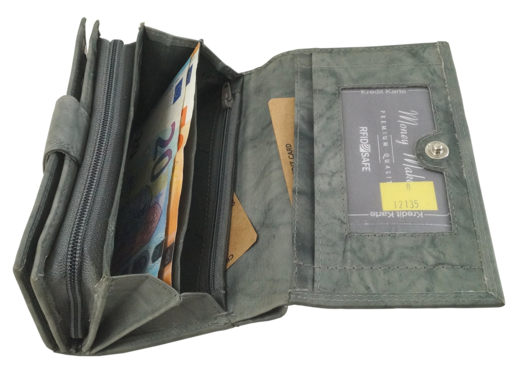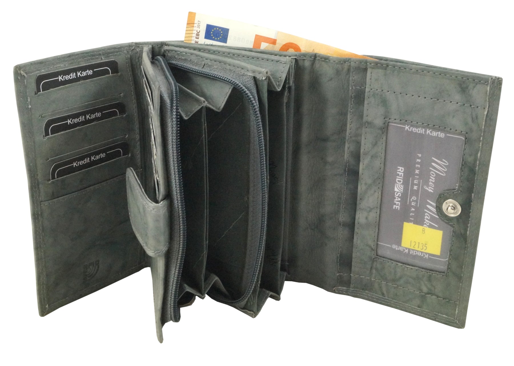 Verschlossen wird die Geldbörse mit einem Druckknopf.