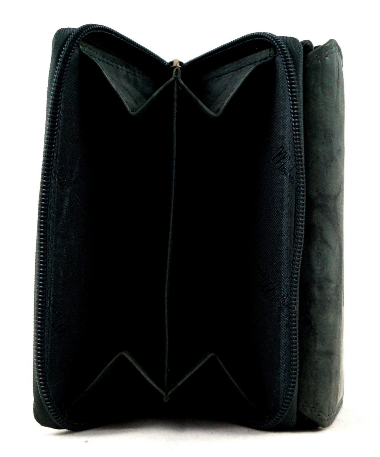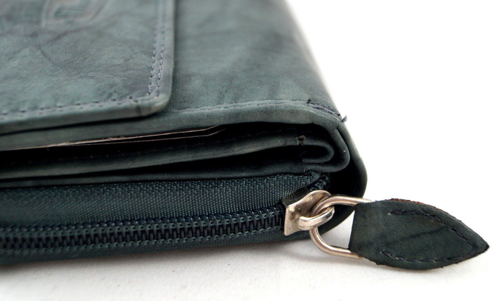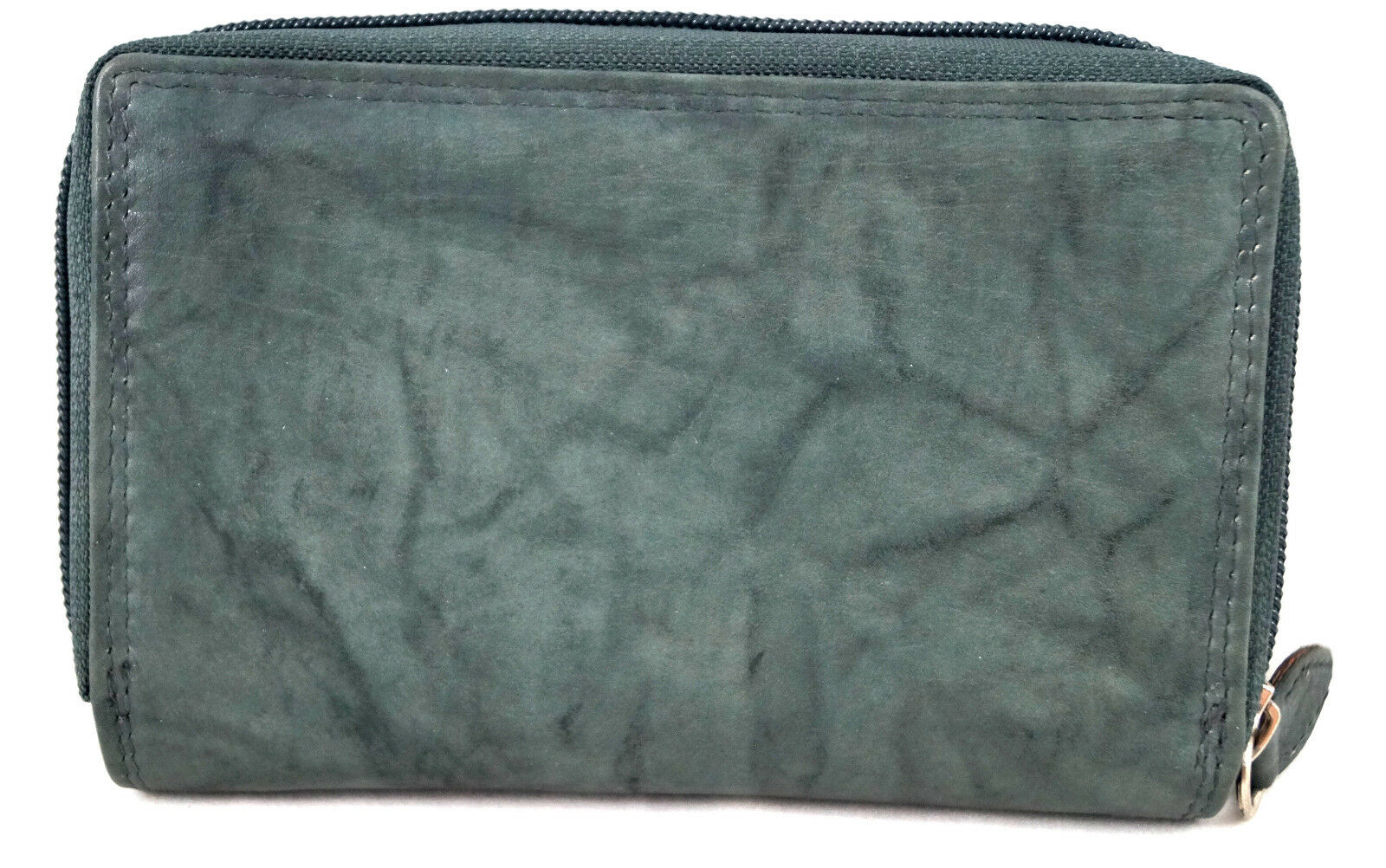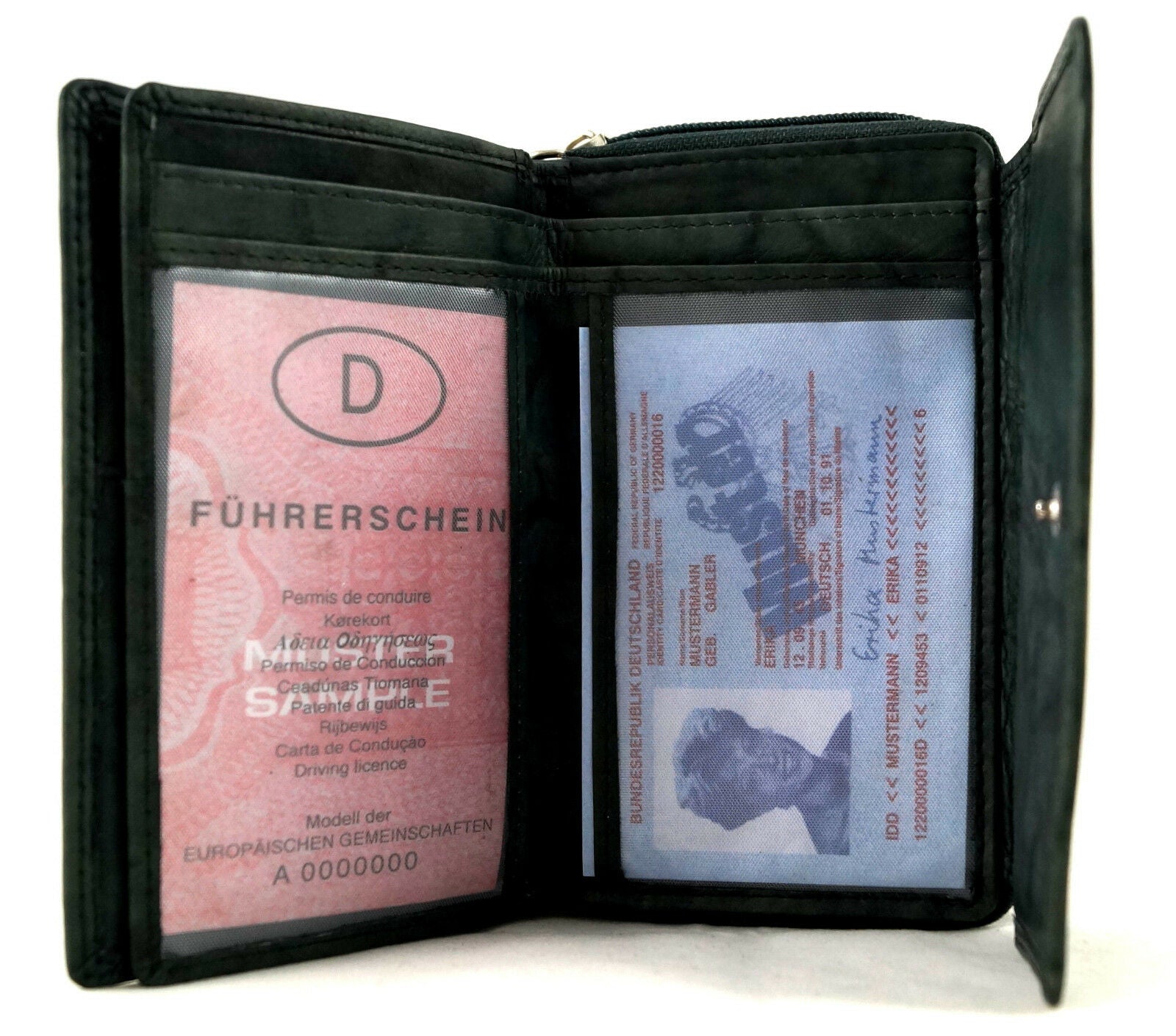 Außen befindet sich das geteilte Münzfach mit umlaufendem Reißverschluss.