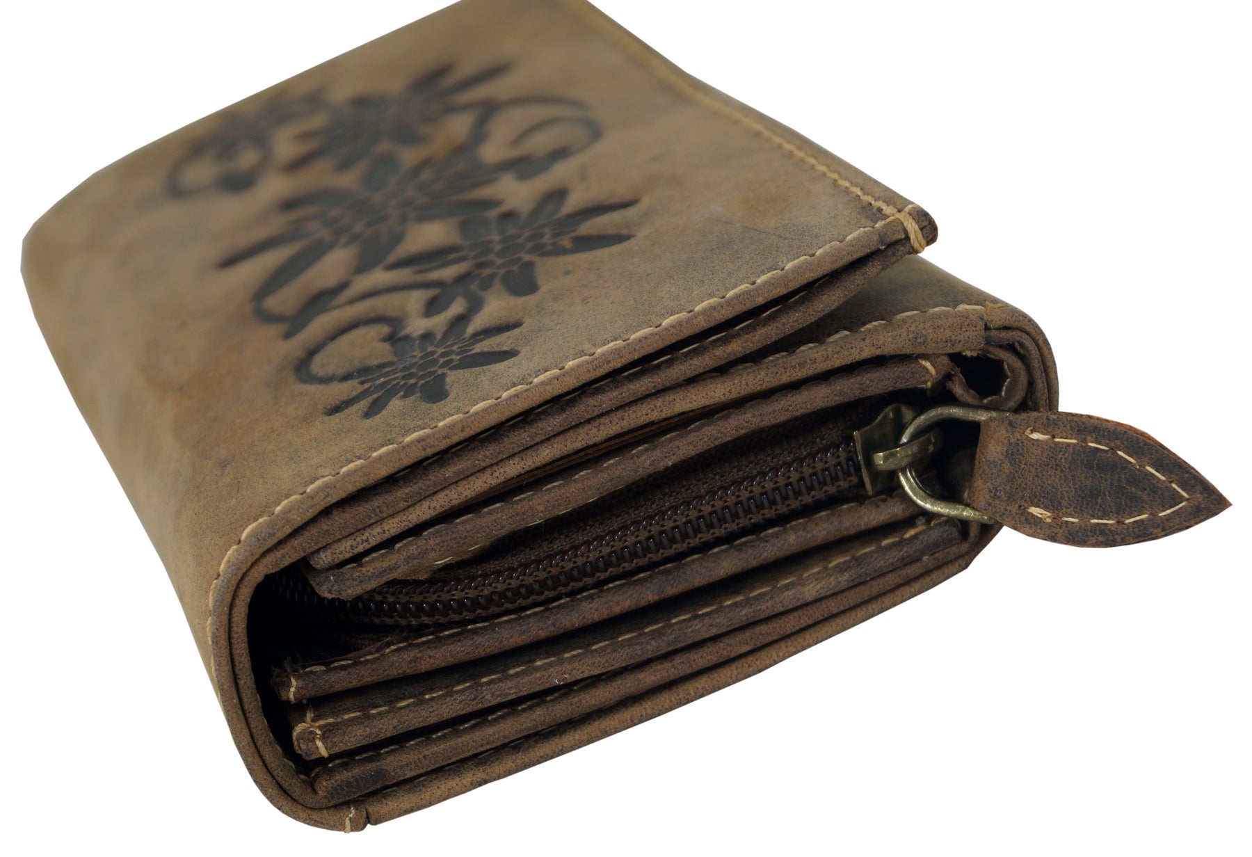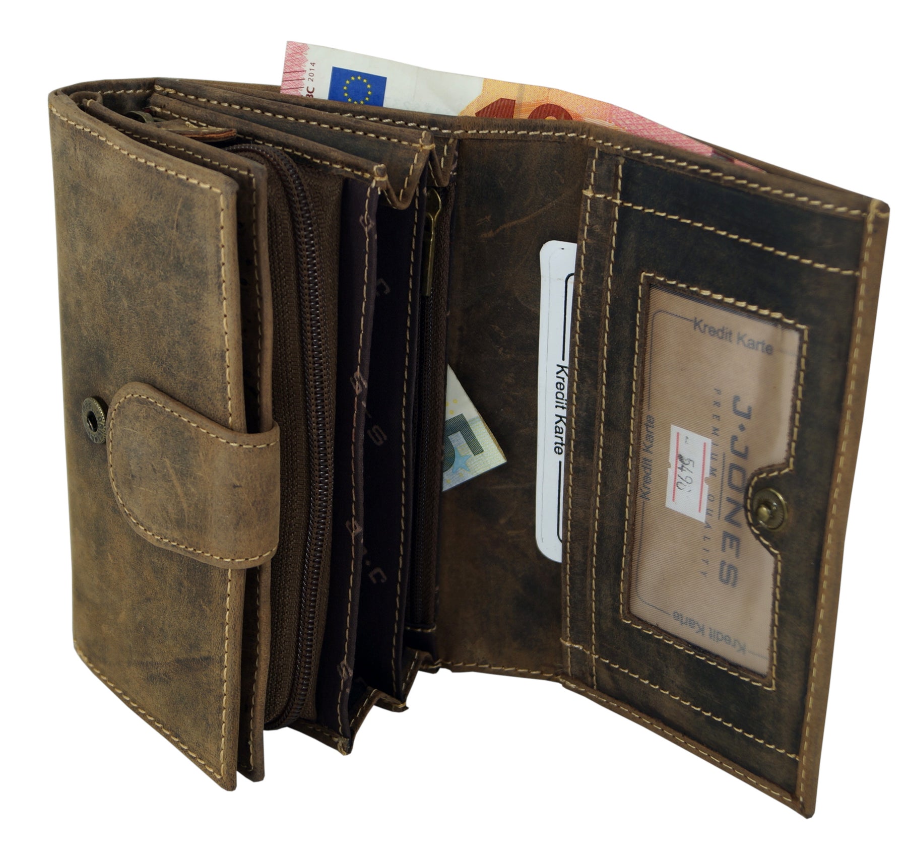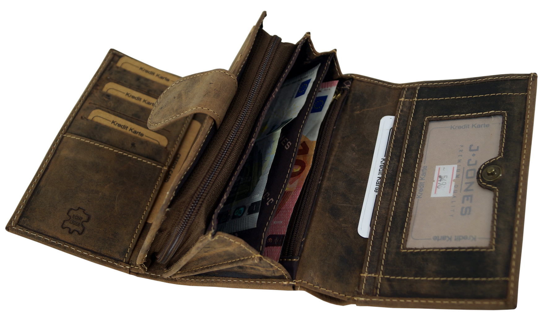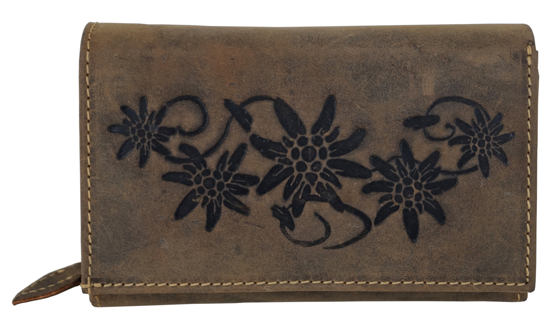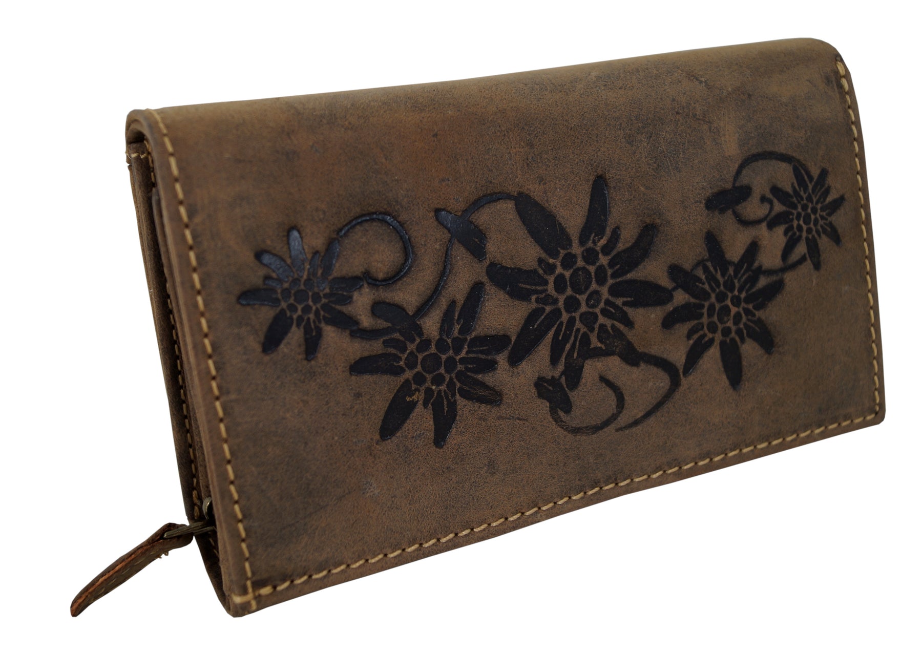 Dieses Schmuckstück aus dem Hause Jennifer Jones besticht durch die natürlich rauhe Gerbung des robusten Rindsleder und das markante Blumenmuster auf der Vorderseite. Hohe Funktionalität, intelligenter Aufbau und viele separate Fächer verbinden sich zum idealen Begleiter für jeden Tag.
