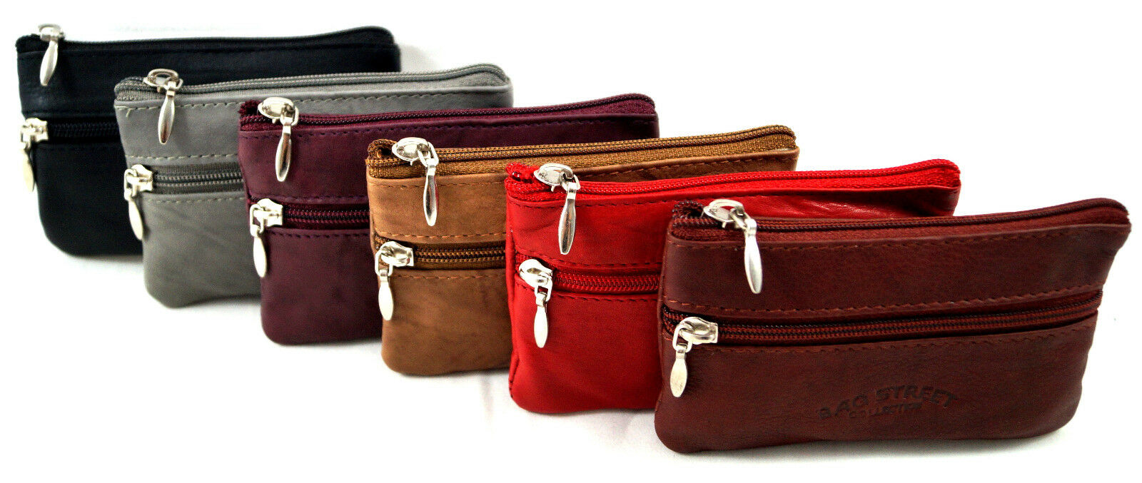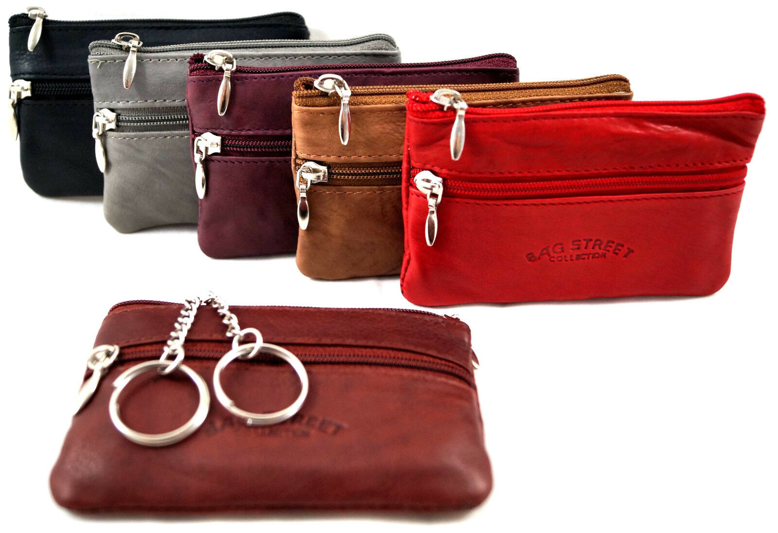 Im gefütterten Hauptfach befinden sich 2 Schlüsselringe an je einer Metallkette.