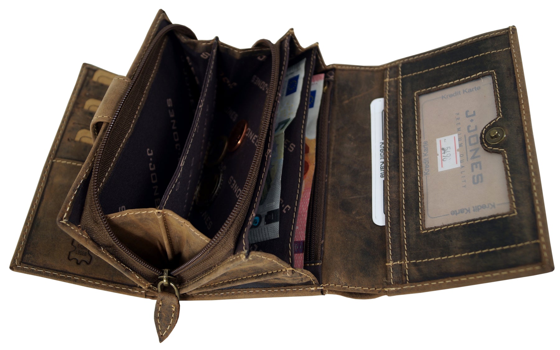 Dieses Schmuckstück aus dem Hause Jennifer Jones besticht durch die natürlich rauhe Gerbung des robusten Rindsleder und das markante Blumenmuster auf der Vorderseite. Hohe Funktionalität, intelligenter Aufbau und viele separate Fächer verbinden sich zum idealen Begleiter für jeden Tag.