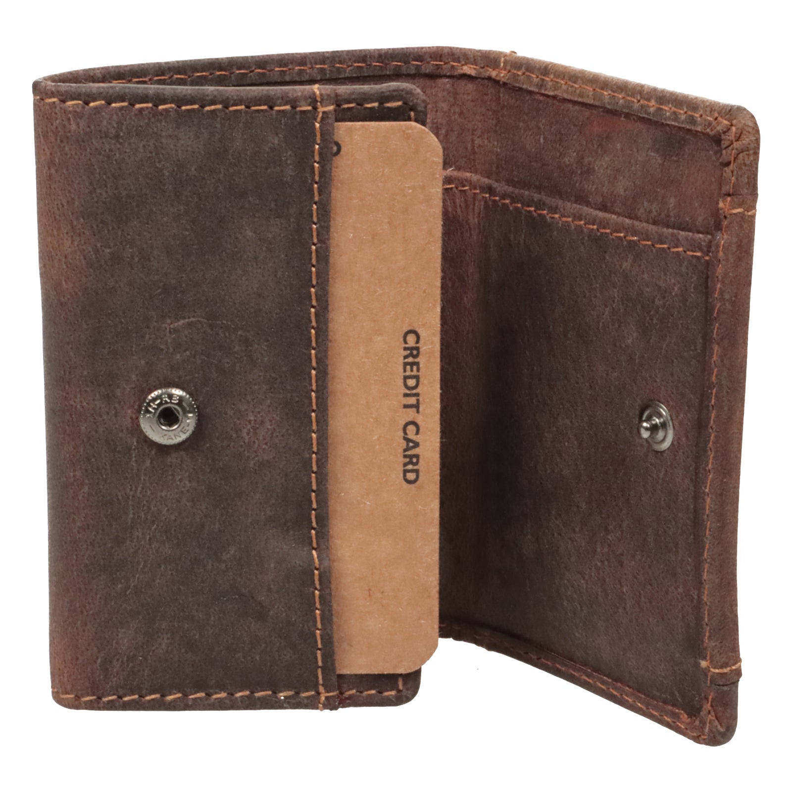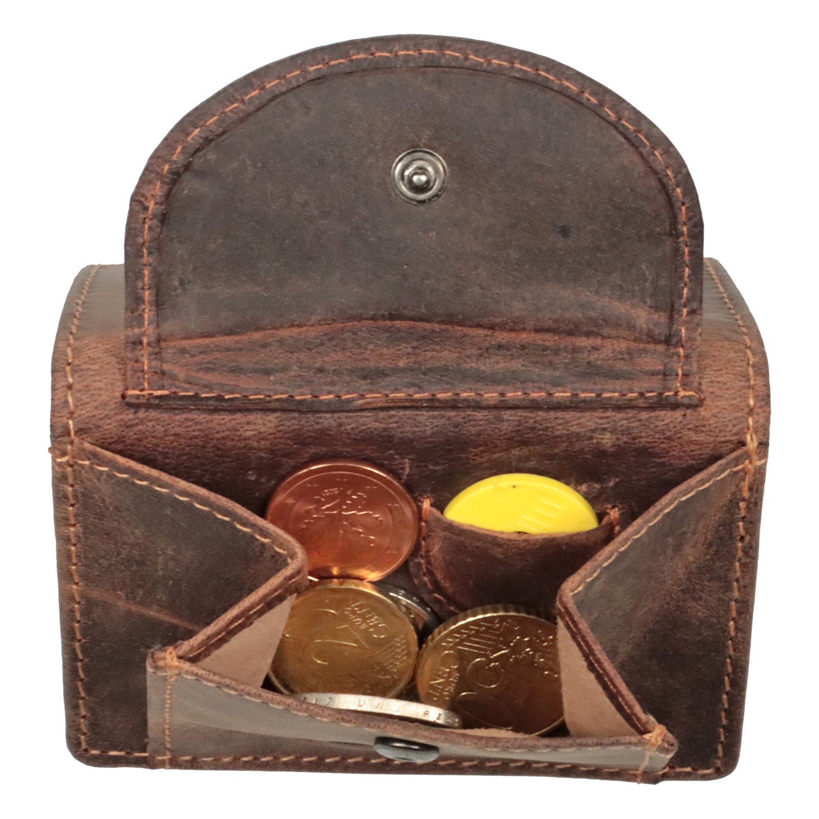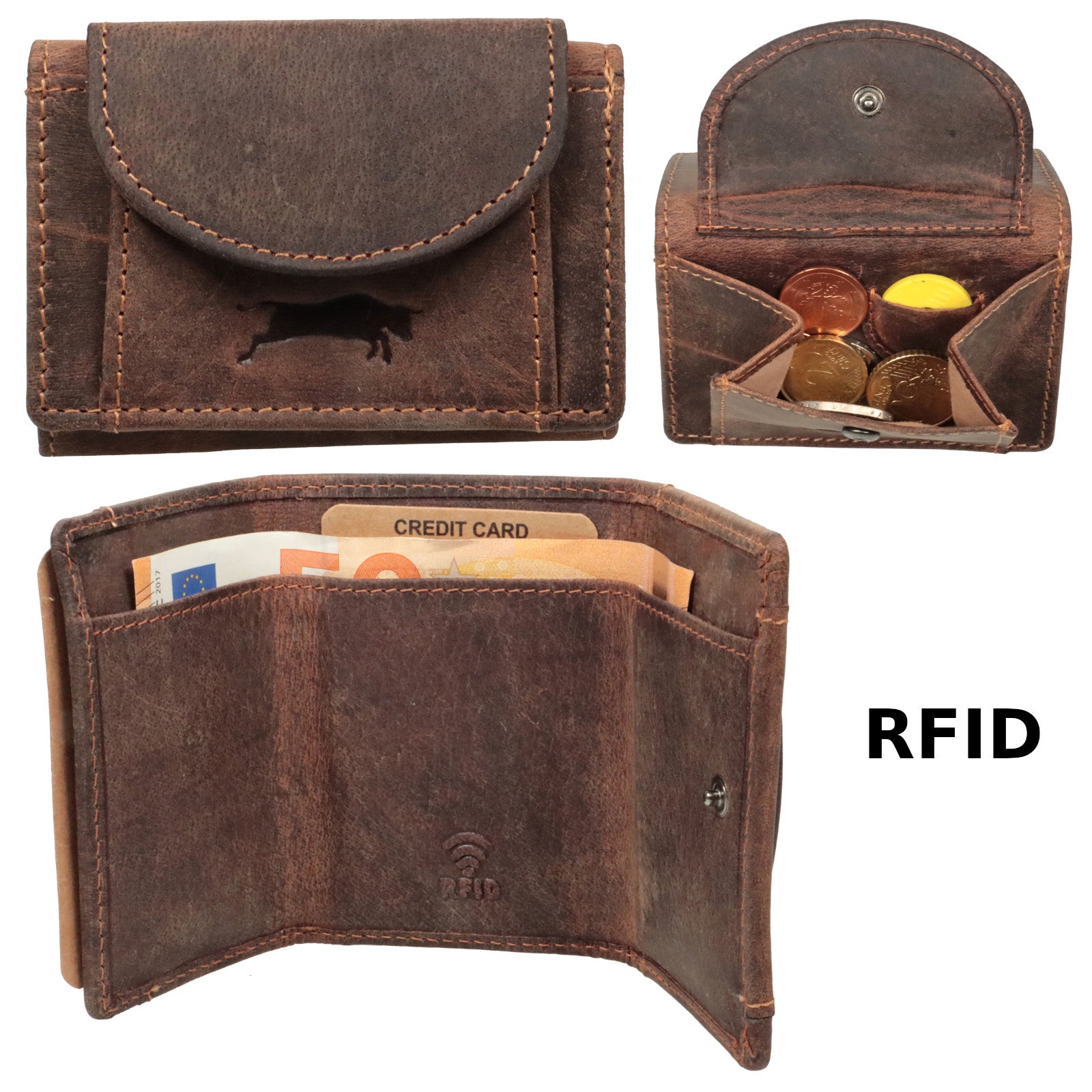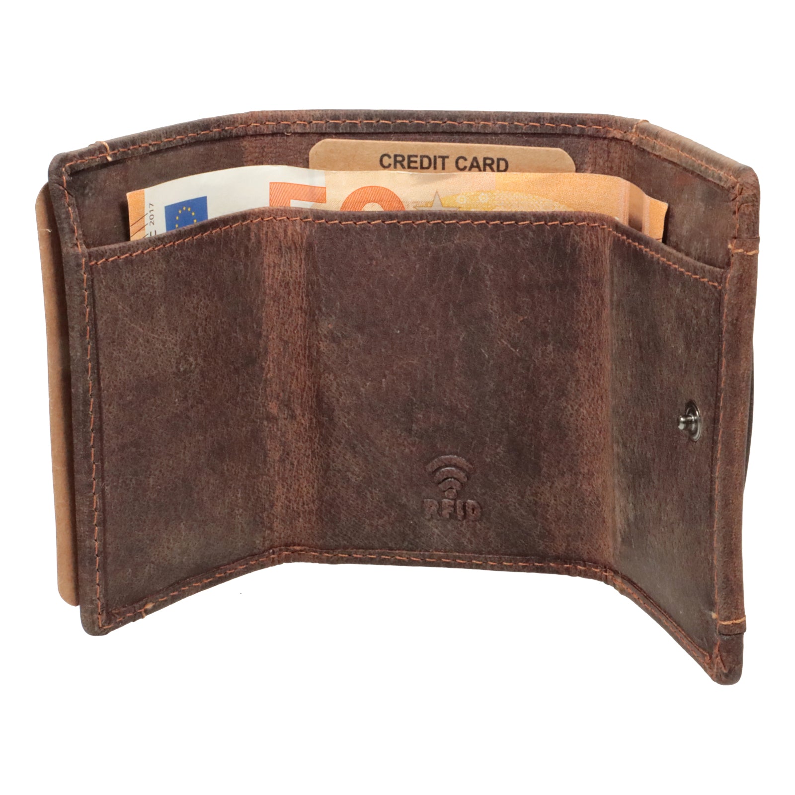 Diese hochwertig verarbeitete Vollleder- Minibörse aus geöltem Büffelleder bietet trotz ihrer geringen Größe viel Platz und eignet sich so neben Ausflügen oder Urlaub auch hervorragend für den täglichen Einsatz! Durch die Dreifach-Faltung müssen Geldscheine nicht extra zusammengefaltet werden, sondern passen vollständig in die Geldbörse hinein. Praktische Details wie das außenliegende Münzfach und der Halter für einen Einkaufswagenchip sorgen für zusätzlichen Mehrwert. Der Geldbeutel ist aus Pull-Up-Hunterleder gefertigt und besteht zu 100% aus Büffeleder. Das Portemonnaie verfügt über einen integrierten RFID-/NFC-Ausleseschutz, so dass ihre Bank- und Kreditkarten vor unbefugtem Zugriff geschützt sind. Das naturnah verarbeitete Leder garantiert dieser Börse einen wunderschönen Alterungsprozess, bei dem erst mit der Zeit der ganze Charme des Produkts zum Vorschein kommt. Auch optisch ist diese Vintage - Börse ein echter Hingucker und bietet ein zeitlos schönes Design! Durch die kompakten Außenmaße passt das Portemonnaie hervorragend in jede Jacken- oder Hosentasche.